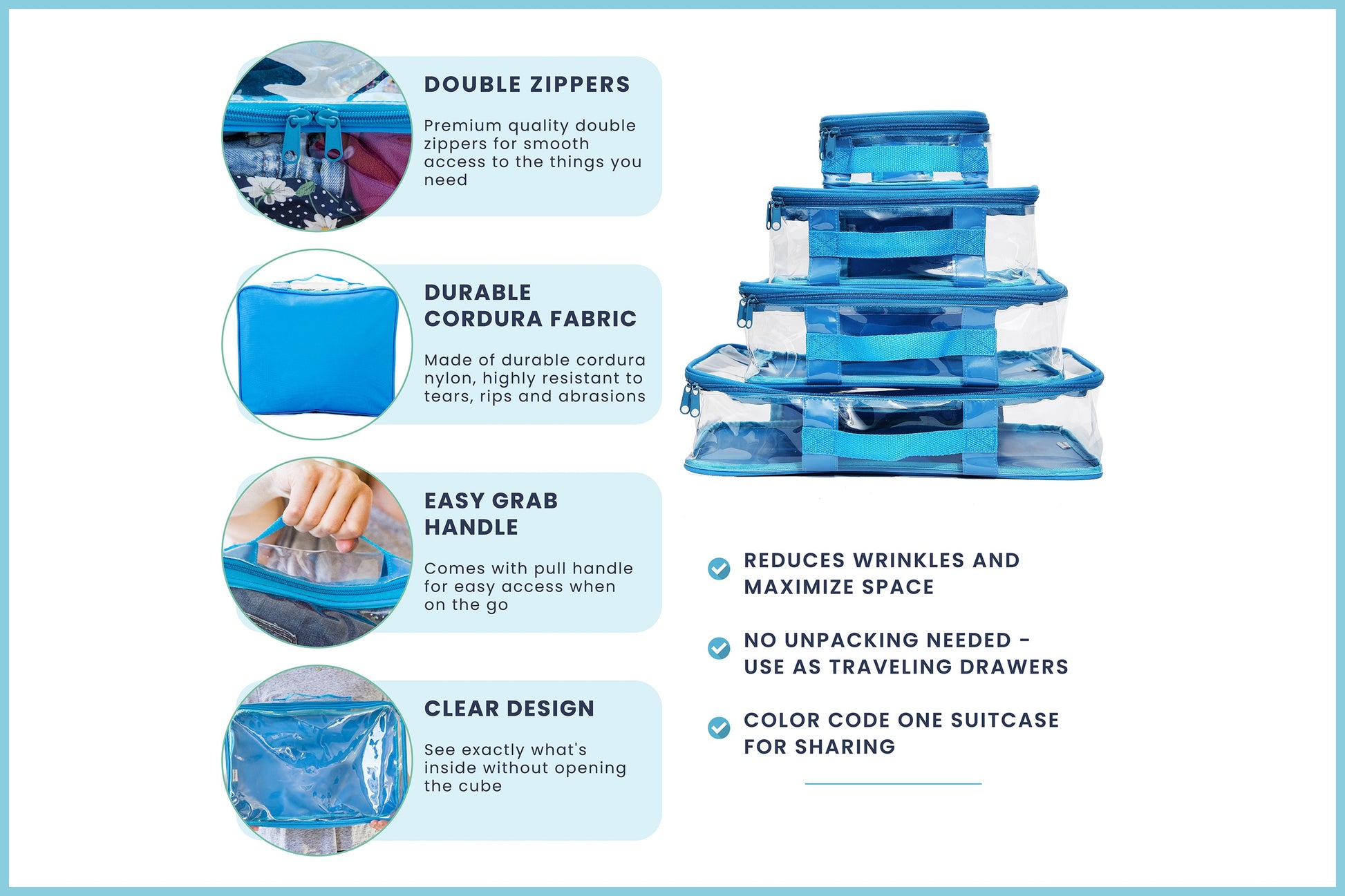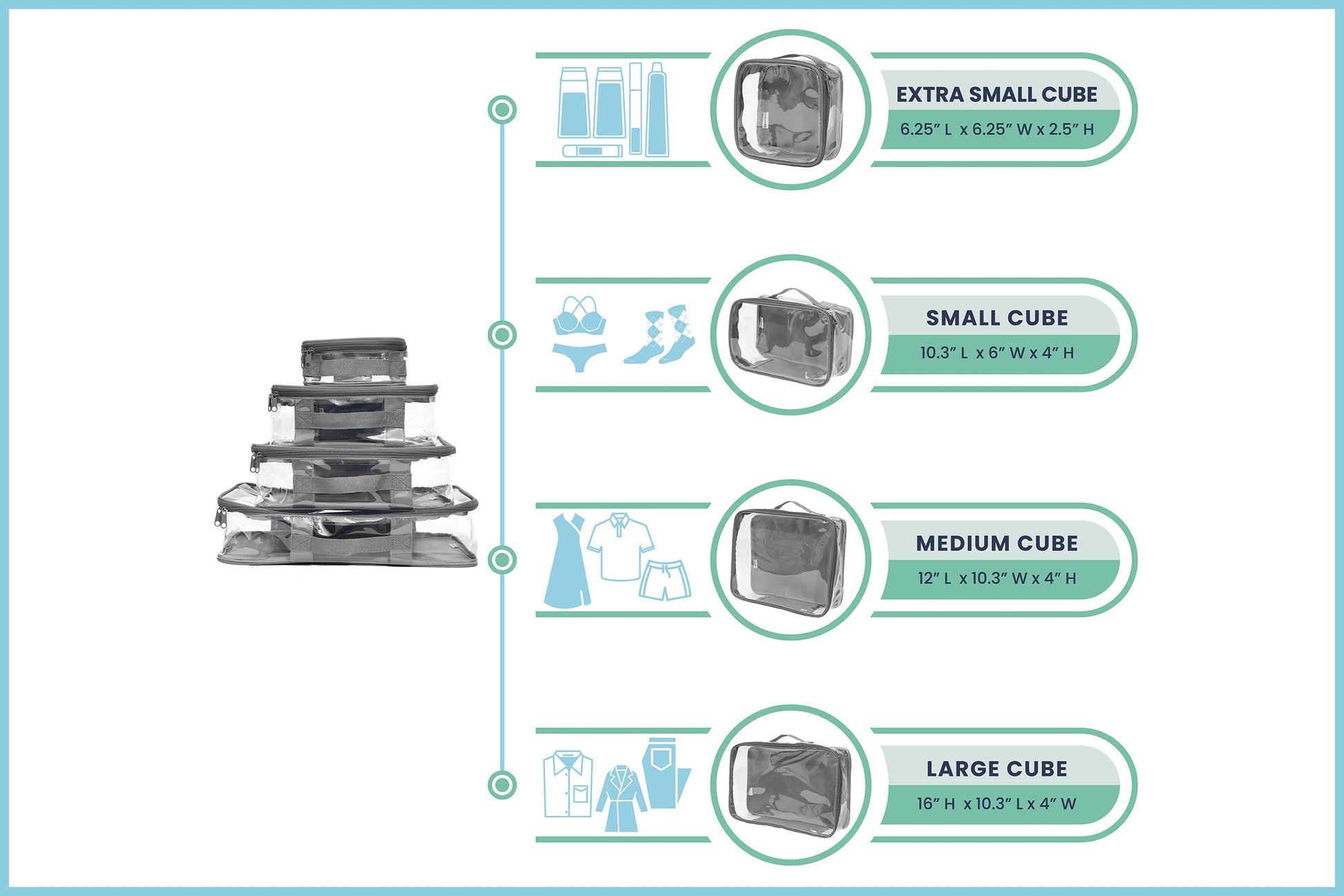 The perfect way to get started with EzPacking. If you travel carry on only, this is the set is for you! This set includes 4 cubes, one in each size.